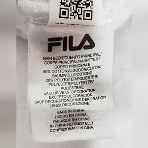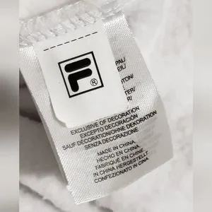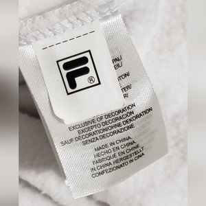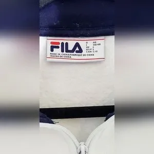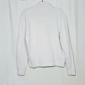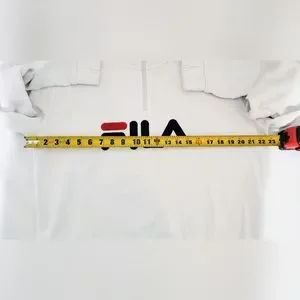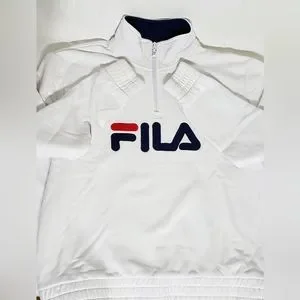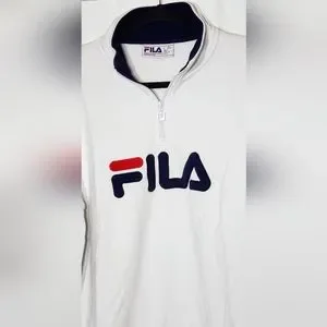 Fresh,crisp white Fila pull over sweat shirt, with zipper, contrasting blue on interior of collar. classic large Fila logo on front with red splash. Wide, soft cuffs and waist band for comfort and style. Cotton/Polyester blend makes this sweatshirt super soft and cozy. Small stain on right front, pictured. Zipper has some small chips from normal wear, otherwise in EUC. please view all photos as they are part of the description.
