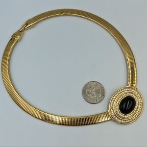 Vintage Gold Tone Snake/Omega Chain Black Lucite Cabachion Rhinestones Necklace