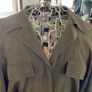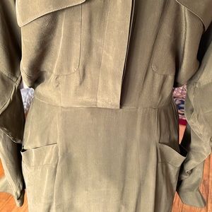 This midi length silk shirtwaist dress is a blast from the past and trending right now. The tailored style is ladylike and comfortable. The elasticated waist is covered by sash belt. The drop shoulders end in cuff with 2 buttons. Well crafted with hidden button front design.