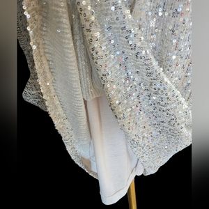 7 For All Mankind Short Sleeve Sequin Mini Dress in Silver and fully lined in beige. It has a straight relaxed silhouette/shirt style, scoop neck, short sleeves, and a slightly rounded hemline.