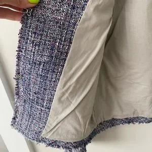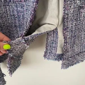 J Crew Purple tweed cropped blazer jacket. One inner pocket and two breast pockets with zipper detail. Hook and eye closure. Cotton blend (exact material details in picture) with raw frayed hems. Dry clean only. Love this jacket for work or for play - looks super cute with jeans! In great condition from a pet and smoke free home. Tag included.