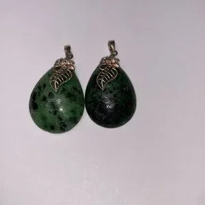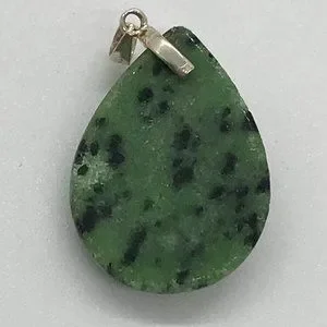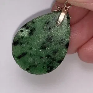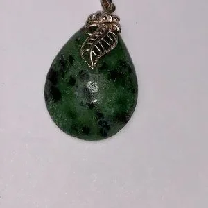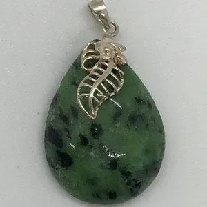 Teardrop Ruby Zoisite natural pendant with a sterling silver leaf bail. It measures 1 1/4”.