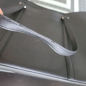 excellent used condition. does show signs of wear on handles, bottom metal feet, interior fabric, and one light scratch on the back of the bag. all are pictured.