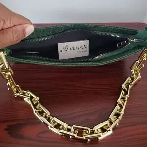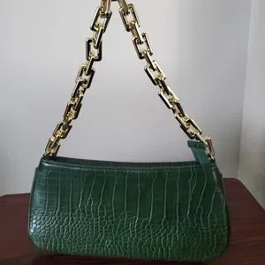 Vegan Brand Handbag, small, green snakeskin with gold-toned short-handle strap.