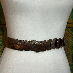 Great looking stamped metal disk elasticized belt. Approx. 25” long laid flat