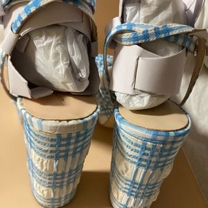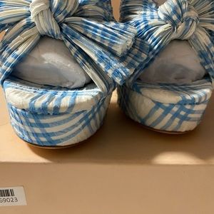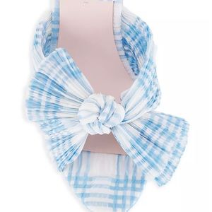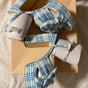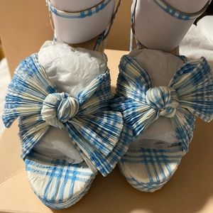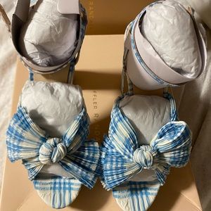 Paid full price but never wore. Crafted of plaid-printed fabric, Loeffler Randall's Natalia sandals feature an oversized knotted bow with intricate pleats. This statement pair is anchored by a platformed block heel.