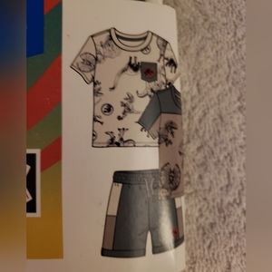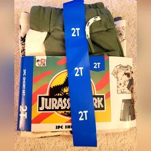 This Jurassic Park 3-piece short set is right on trend. He will have the option to choose from 2 pullovers. Option 1 is an all over print short sleeve t-shirt with chest pocket that has a gel screen print. Option 2 has a cool large dinosaur screen print that says “Jurassic Park”. Either top can be paired with the French terry short. The short has detail piecing in coordinating colors. Shorts have a full elastic waist and nonfunctional drawstrings. Having the easy pullover tops and pull-on short, will make him feel like a big boy dressing himself. Tops can easily be worn with other shorts, jeans or sweat pants. Easy to match! Whatever the choice he will look so cool, comfortable and confident. This is a great addition to any little boy’s wardrobe. Tops are jersey knit made of 60% cotton 40% polyester. Shorts are French terry made of 60% cotton 40% polyester. All pieces are machine washable.