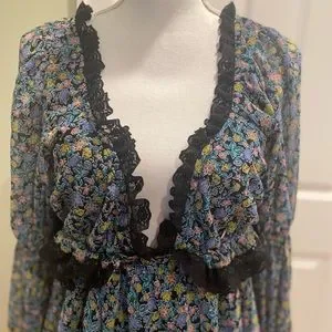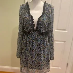 Long Sleeve Mini Dress Black Combo Size Large. Forever femme in a ditsy floral print, this so sweet mini dress is featured in a babydoll-inspired design with lace adorned detailing and exaggerated sleeves for added dimension. With tie back detail for a custom fit.
