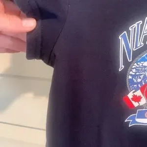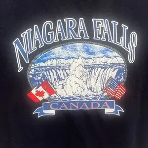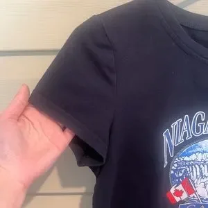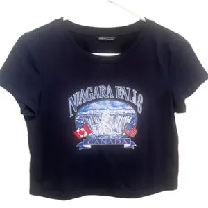 Niagara Falls USA/Canada boarder crop top. Navy blue color with both flags and the falls represented. Double stitch on the sleeves not rolled. Super soft and comfy top. Feel free to ask questions and offers welcome. :)