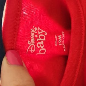 size 12 months. 2 piece outfit. red tshirt and gray pattern overalls. very soft. Mickey Mouse
