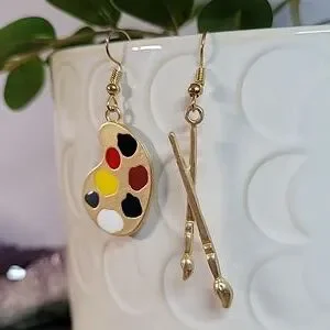 A painter's palette on one side, and a little paintbrush on the other.. both on hypoallergenic wires and nicely weighted.