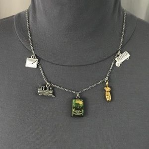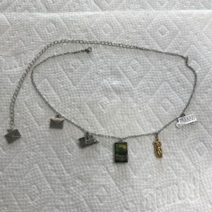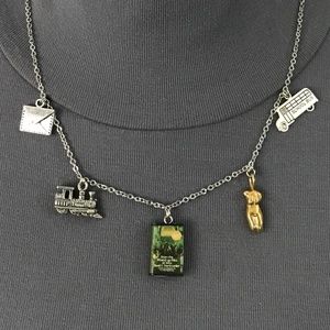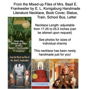This unisex necklace features (from left to right), a silver envelope charm, for the anonymous letter Claudia and Jamie write about their theory that the angel sculpture might be by Michelangelo. Next is a silver train charm, for the train Claudia and Jamie take to Manhattan. In the center is a book cover pendant. To the right is a golden statue charm, for the angel sculpture the children become intrigued with. Last is a silver school bus charm, since Claudia and Jamie make their plans to run away partly while on the school bus. This necklace has been newly handmade just for you, is adjustable from 17.25 to 25.5 inches (can be made shorter or longer upon request), and is from a smoke and pet free home.