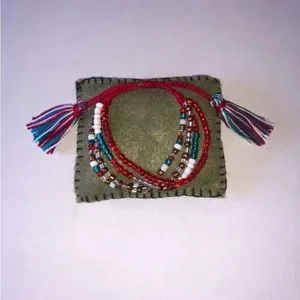 The multi-strand beads adjustable bracelet is handmade with four adjustable bead strands. Made with glass beads in turquoise, red, brown, white and clear colors strung on a cotton cord. Macrame slip knot clasp with soft cotton tassels in turquoise, white and red colors.