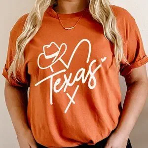 Embody the essence of Texas with our 'Texas Cowgirl heart and Hat' t-shirt. Crafted with a heart encapsulating the word 'Texas' and graced by a cowgirl hat, this tee is all about southern elegance. Pick from a spectrum of colors and sizes, available only on our website. Every purchase supports our passionate small business, uniting Texan warmth with everyday style. Perfect for game days and tailgates!
