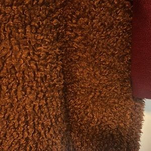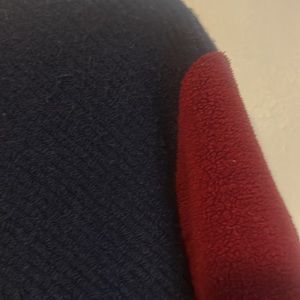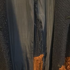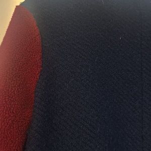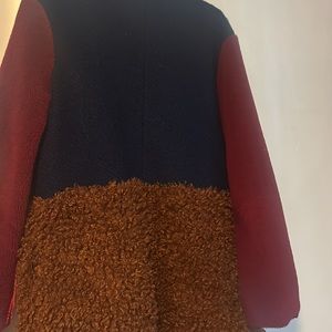 Colorblock coat. Beautiful. Lots of wear left. Torn interior that can be restitched down the middle. Jacket not affected. Hook closure up top and middle front of the coat. Navy, red and caramel color block. Stylish! Got lots of compliments