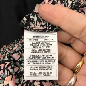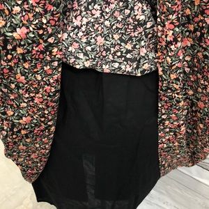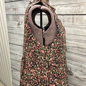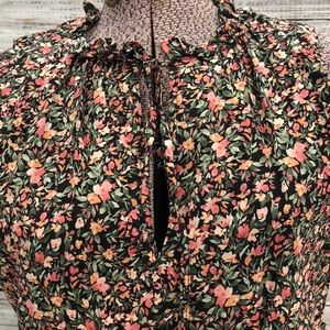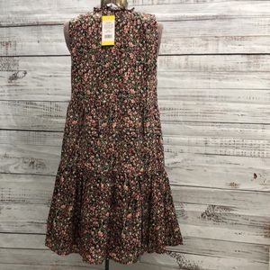 Size-M, black base with shades of green leaves and flowers in shades of pinks and oranges, slightly tiered, little to no give, fully lined, tie front closure, small ruffles around the neck, sleeveless, it’s short but not quite mini ( unless you are tall). Brand new with tags, never worn.