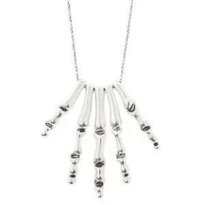 Silver-tone statement necklace with metal skeletal finger pendants.
