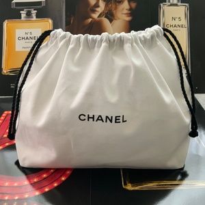 All white with black CHANEL logo and black drawstrings, this bag can be used as a gift bag, storage, dust bag, make up bag, jewelry bag, drawstring hand purse, travel accessory.