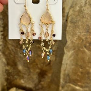 Gold plated beaded dangle earrings . They have simulated Citrine gemstones and rainbow resin beads . Length is 3.8 inches and light weight . New with tags !