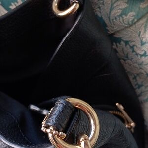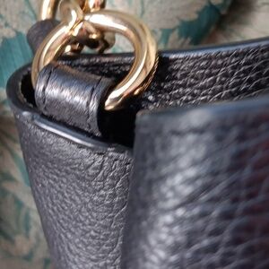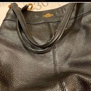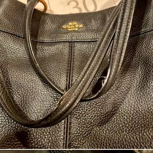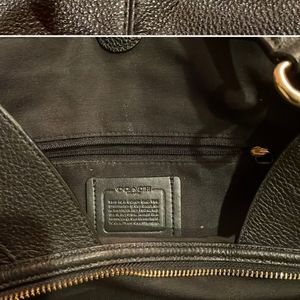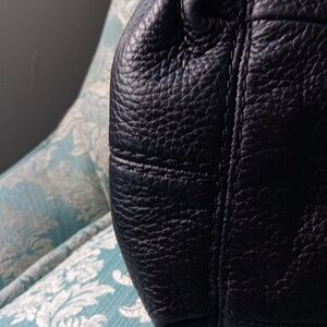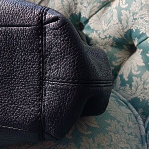 Beautiful pebbled leather bag. Gold hardware. The bag has 3 separate compartments on the inside, each with additional pockets snap closure on the top and a zipper closure on the middle compartment. slight wear on handle