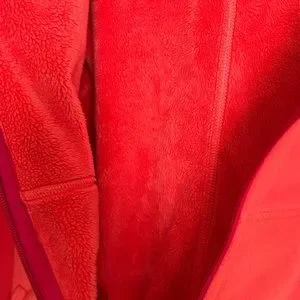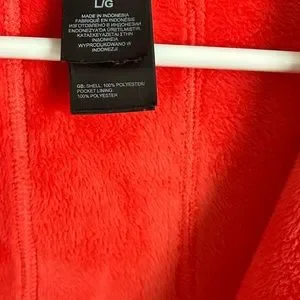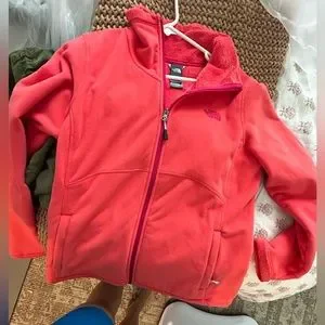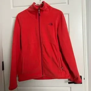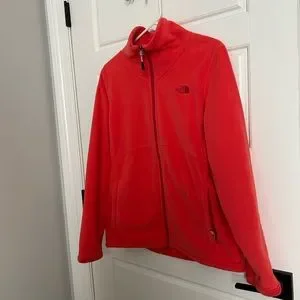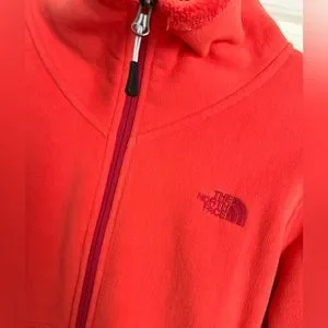 The North Face Fleece fuzzy lined jacket Size Large. A pretty hot pink coral color. Some photos look red but more pinky orange. Has a fuscia logo and zipper track. Basically brand new without tags. Smoke free home