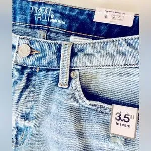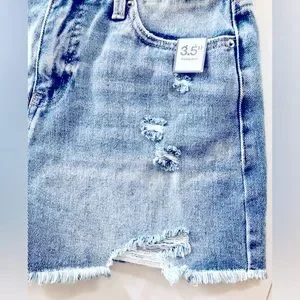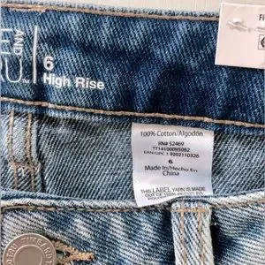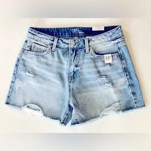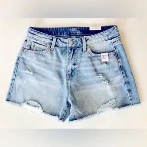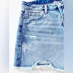 100% cotton vintage, blue distressed denim, high waist 5 Pocket shorts, size 6.