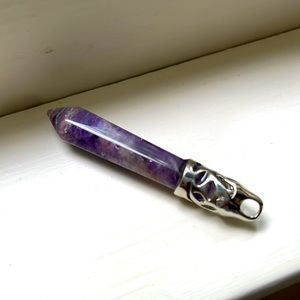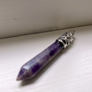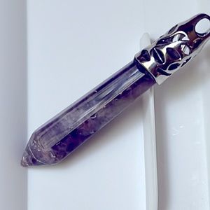 Gorgeous natural Amethyst point pendant or pendulum with jewelry grade rhodium fitting in silver color measuring a good 2.5“ long. Some say wearing Amethyst helps relieve stress and anxiety and can help reduce headaches and improve bone and joint health. But I say it will make you happy to see the beautiful shades of rich purple in this fantastic piece of genuine Amethyst.