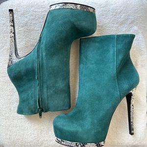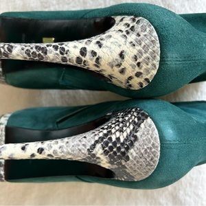 These booties are fabulous and include green suede material and reptile accent on heel and trim around toe area, 1 inch built in platform, cushion footbed, side zipper closure, 5 1/2 inch heel, size 8.5M, brand new/never worn and in excellent condition. These are hot!🔥