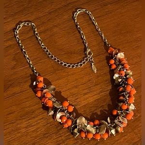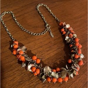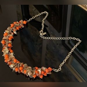 Lovely vintage gold tone necklace with a focal of clustered orange and gold beads, and shimmering gold disks. Gold tone chain with lobster claw clasp. Dangle tag is signed “VCLM TM". 20” adjustable. In excellent vintage condition.