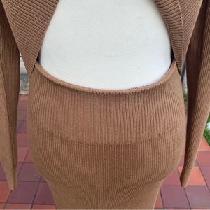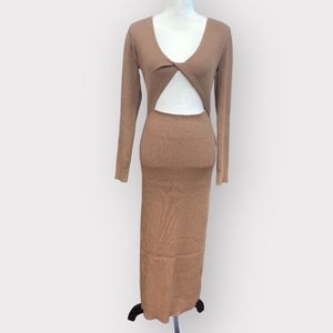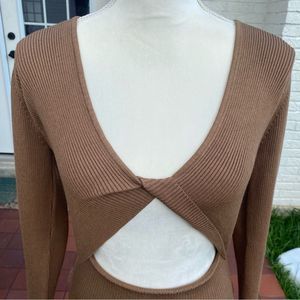 Crafted from ribbed camel colored fabric, it features a sexy front cutout and a bodycon fit that shows off your curves.