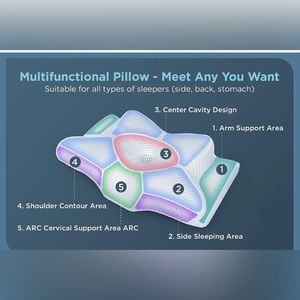 ERGONOMIC PILLOW - The unique design of hollow & butterfly patented contour mimics the human anatomy. No matter whether side, back, or stomach sleeper, our cervical pillow improves sleeping position to a pain-free neck. With special curves, divots & angles, the orthopedic pillow allows you to shift positions comfortably and even provides special armrests for your shoulder & arm to release numbness & pains.