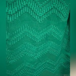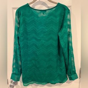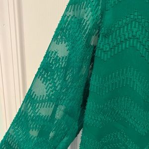 The pictures do not do the color of this beautiful green blouse justice. Sheer overlay with a lining underneath. Perfect for work or a dressy occasion. In great condition.