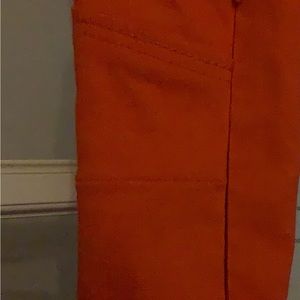 This beautiful dark orange, Fitted bodice and fitted on the hips, flared bottom , corset seeming around the bust. Side zipper and side pockets. Some stretch in tge fabric to adjust to your curves. 🧡