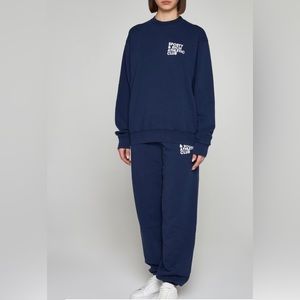 Sporty & Rich’s navy blue cotton sweatpants featuring elasticated waist and hems, side pockets, back patch pocket and Exercise Often logo print on the front.