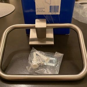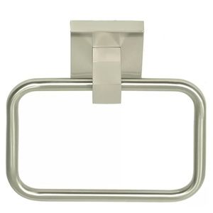New, opened box. Rectangle Towel Ring- Brushed Nickel Finish. Metal. 6" H x 7" W x 2.25" D (.6 lbs)