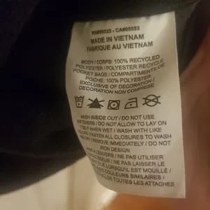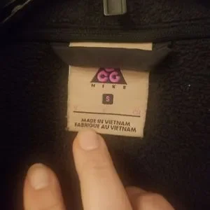 The Nike ACG Polartec® Fleece Jacket is designed with features like a high-neck collar and front zip closure, which make it an excellent choice for outdoor adventurers. Its polyester lining material provides warmth and comfort. The jacket is labeled as a size small, and it's a regular fit.