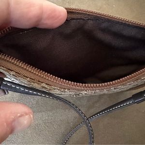 Classic Coach fabric with suede and leather trim. Leather strap with silvertone hardware. Fabric lining. Barely used. In like new condition. Pet and smoke free home.
