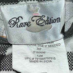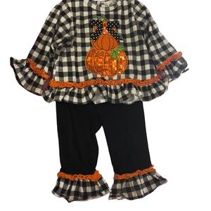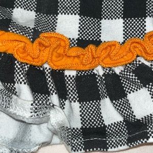 ℹ️ Rare Editions Black and White Plaid, with orange and green colored plaid pumpkin fall matching set design. Long Sleeve black and white plaid design top with orange pumpkins design in the middle front of the top. Has a polka dot pumpkin, felt material pumpkin and a orange sequin pumpkin stacked together design. Has green vines stitched on with felt material green leaf designs and a black & white polka dot bow with a orange gem in the center of the bow. Has flare bell sleeves with orange ruffles on the sleeve hemlines, and a orange ruffled bottom hemline of the top. Has black buttons on the back of the top and comes with black leggings to match with black/white plaid and orange ruffled bottom leg hemlines. This outfit is still in excellent used condition. Would be perfect for Fall. Casual or Dressed Up. Love it? Make me an offer! I’m very reasonable 🤗