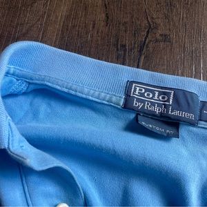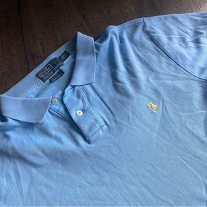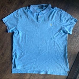 Size large men’s Polo Ralph Lauren polo shirt. Baby blue with yellow pony. Lightly worn, no stains or holes. Custom fit and very soft!