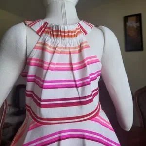 Cute summer dress. White with multi-colored pinks and orange stripes.