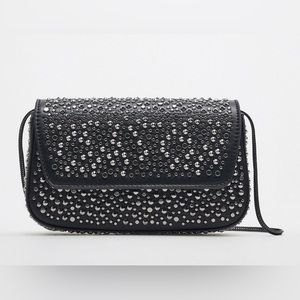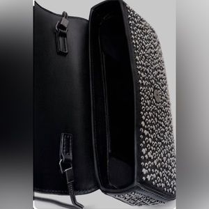 Crossbody bag with studs. Long metal strap. Lined interior. Magnetic closure at flap. , Height x Length x Width: 8.7 x 5.1 x 2 inches (22 x 13 x 5 cm)