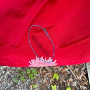 Made in Hong Kong. 100% silk. Red with pink floral pattern. Long sleeves. Fabric covered buttons and loops at neckline with hook and eye at neck. Piping across shoulders and down sleeves and also outlining shoulders/arm openings. Great lightweight, midi length dress. Beautiful piece! Late 70s, early 80s. Good condition, missing the top button. Some light spots and one spot near hem at front that looks like a piece of tape was removed from there. There is also one flower that has a shadowed look to it.