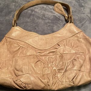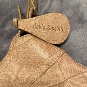 Questions? Leave a comment below! This is a David and Scotty tan shoulder bag with green interior. There’s a couple of pen marks on the inside. Please see picture and a couple of marks on the outside but it’s in good condition.