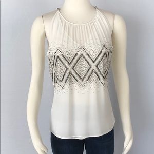 NWT WHBM Dressy.. Diamond Shape Design... Beaded/Pearl/Rhinestone Top... lined.. Metal Ball Detail.. Size XSmall...Ecru... Length 26” From Shoulder... 100% Polyester…. Liner….97% Polyester 3% Spandex...Machine wash Cold…. 18 1/4’ laying flat pit to pit…