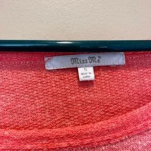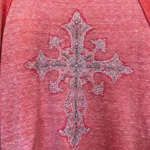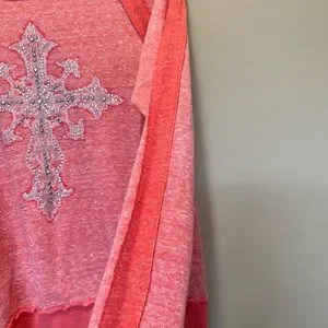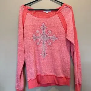 Coral colored crew neck sweatshirt, Miss Me, Women’s, bling cross