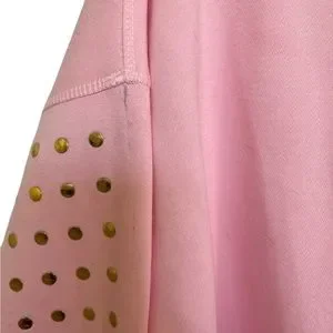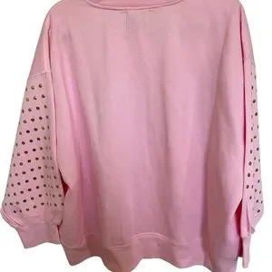 Oversized pink sweatshirt with crew neck. Size large. Gold detailing on sleeves. Festive and fun! Patches spelling out grinch and a heart. One minor flaw in upper arm, but not very noticeable- see photos.
