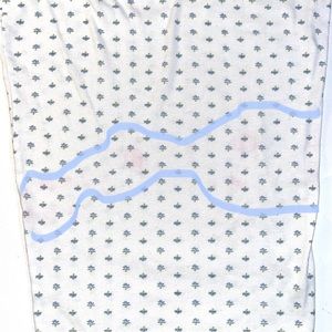 Chaps brand pajama set. Cotton blend knit (has some stretch). Elastic waist pants, button front top with V-neck. Placket and neckline have subtle feminine ruffle all around. Fabric has white background with tiny blue flower print all over. **Please note: pants have areas of very light pink staining, mostly on back of right leg. They were accidentally washed with a burgundy washcloth. Very comfy and cozy set. VGUC. Comes from a pet friendly, non smoking home. 😺🐶🚭