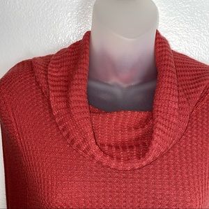 Size small, great condition no flaws, mauve pink coral color it’s very unique , cowl neck line, thermal, drop shoulder, skinny wrist area,