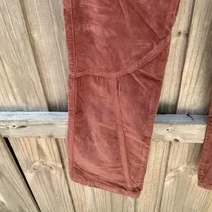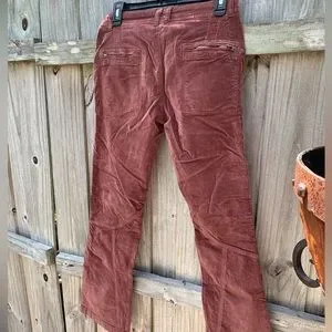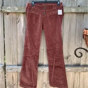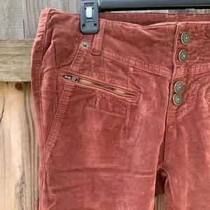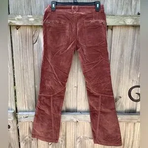 Low rise slim flare silhouette , inverted front yoke seam, exposed button closures , zippered pockets throughout, uncut corduroy fabrication with velveteen finish, 98 cotton, 2 elastine , these do run large.. I would say about one to two sizes bigger