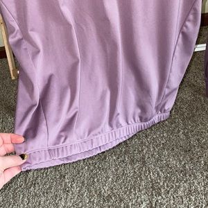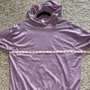 Purple hooded Under Armour Dri-fit pullover. Measurements in photos. Had elastic band at bottom. Thumb openings on sleeves. Smoke/pet free home. Worn maybe twice.